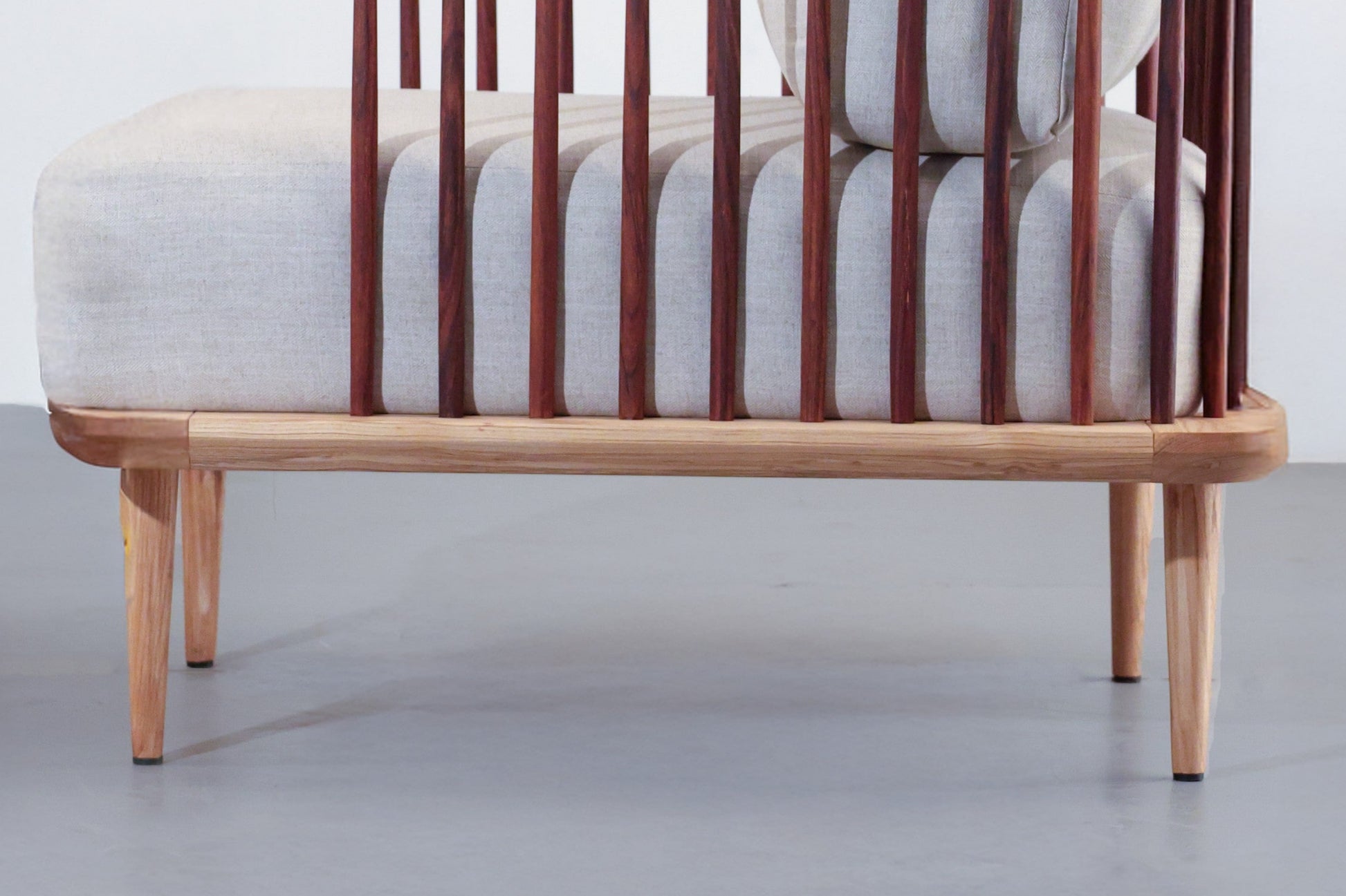 A perfect companion to the Aiko Lounger, this design offers deep, inviting seating in white ash paired with plush, generously filled cushions for ultimate comfort. The elegantly crafted rosewood spindle back and sides lend a sense of lightness and refinement, while its graceful profile makes it a natural fit for both contemporary and classic interiors. Thoughtful detailing and expert craftsmanship ensure it not only provides a cozy place to unwind but also enhances the aesthetic of any space with its understated sophistication.