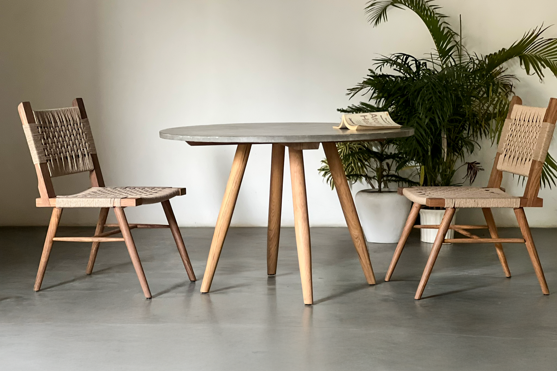 A seamless blend of strength and style, this Concrete Circular Dining Table is crafted for both residential and commercial spaces. Designed with a smooth, hand-poured concrete top and a perfectly round silhouette with a Ashwood Base legs, its minimalist form encourages connection around the table. The sturdy build and natural texture bring a modern yet grounded character to any space, making it perfect for cafes, restaurants, and dining areas that invite conversation. Built to withstand daily use while elevating the aesthetic of its surroundings.