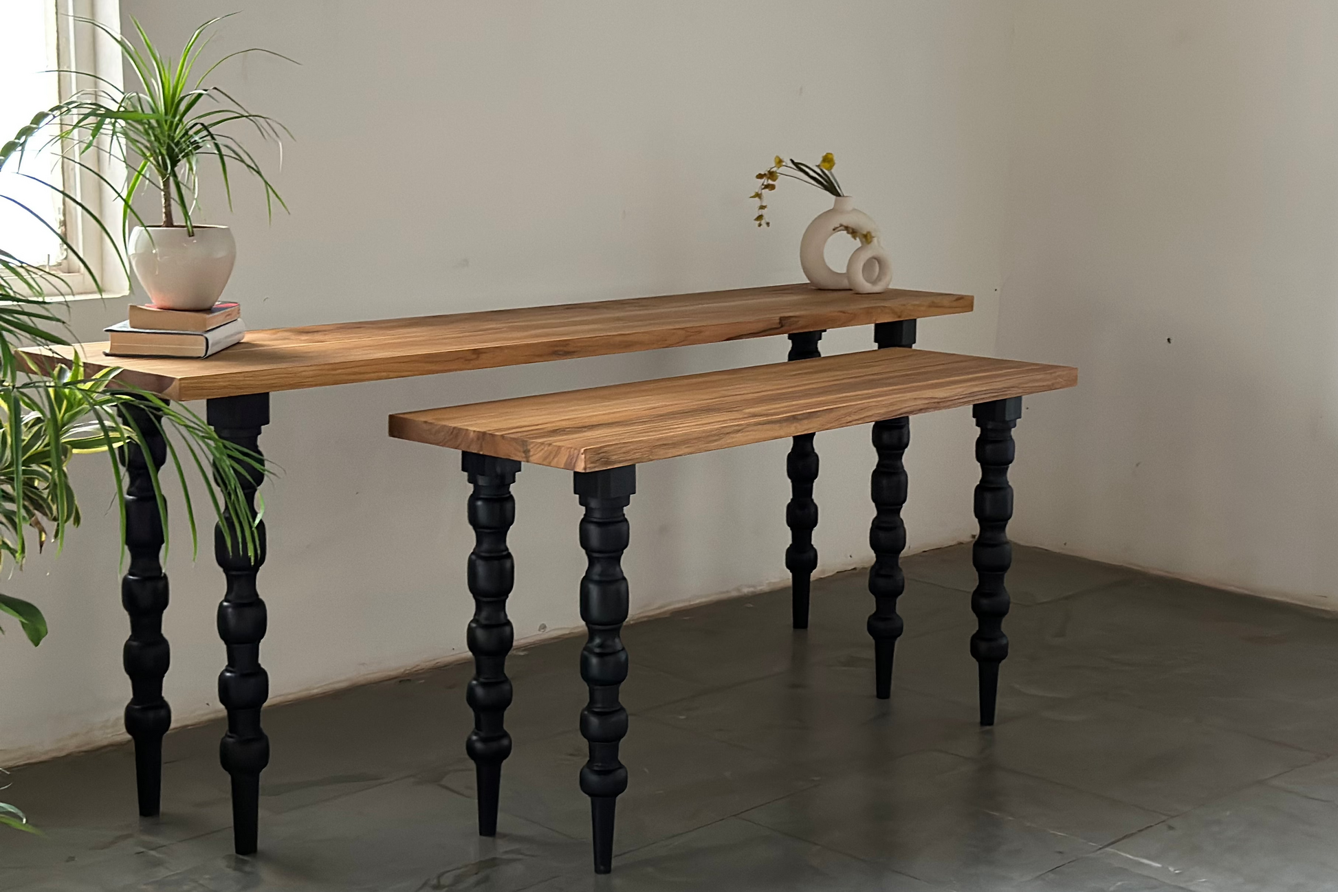 The Rhine Console is crafted from solid wood, featuring intricately carved spindle legs finished in matte black for a bold contrast. The lighter wood top showcases a clean, minimalist form, while the Belgian oil finish enhances the grain and provides lasting protection—bringing together craftsmanship, contrast, and elegance in one refined piece.