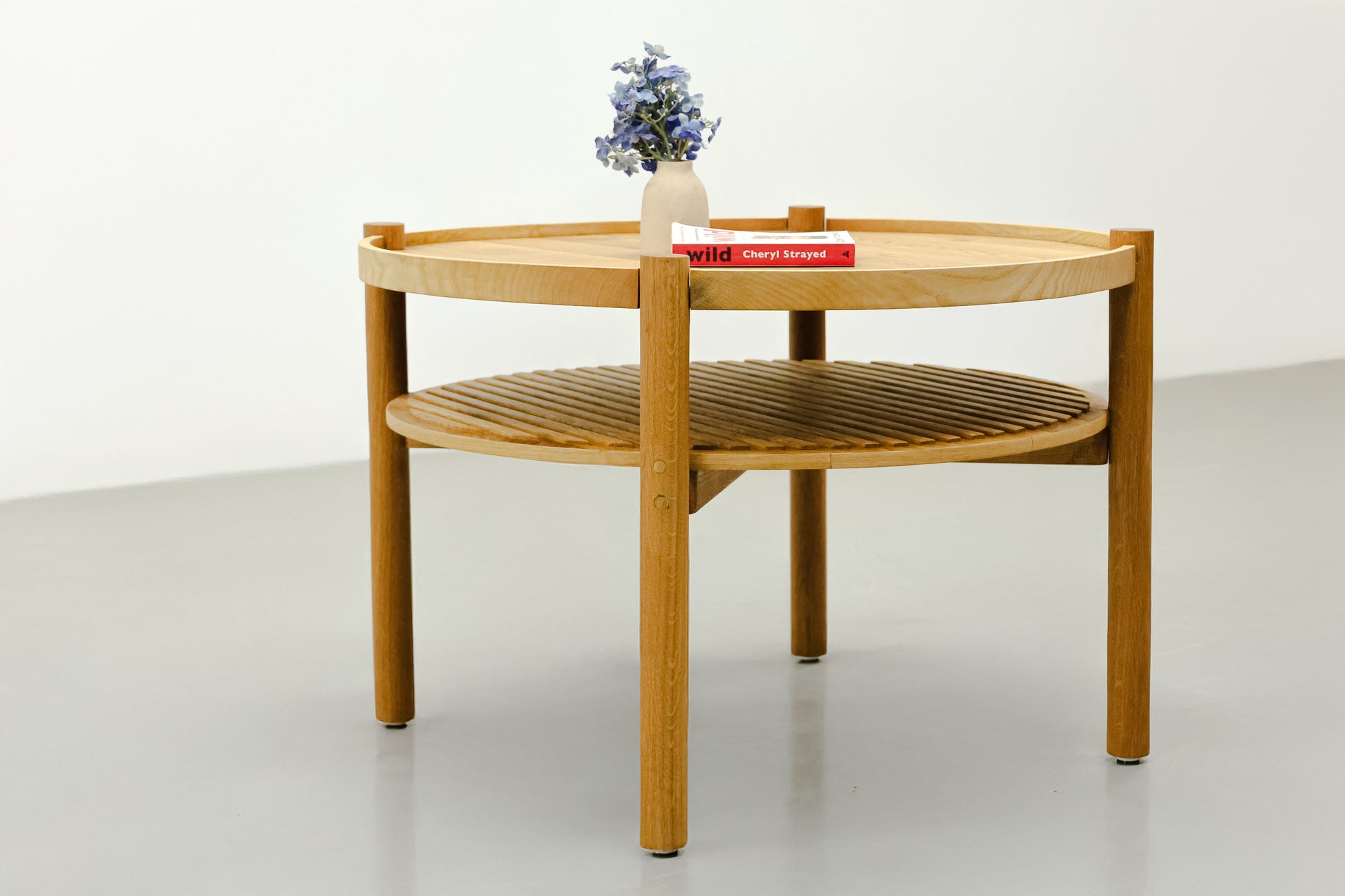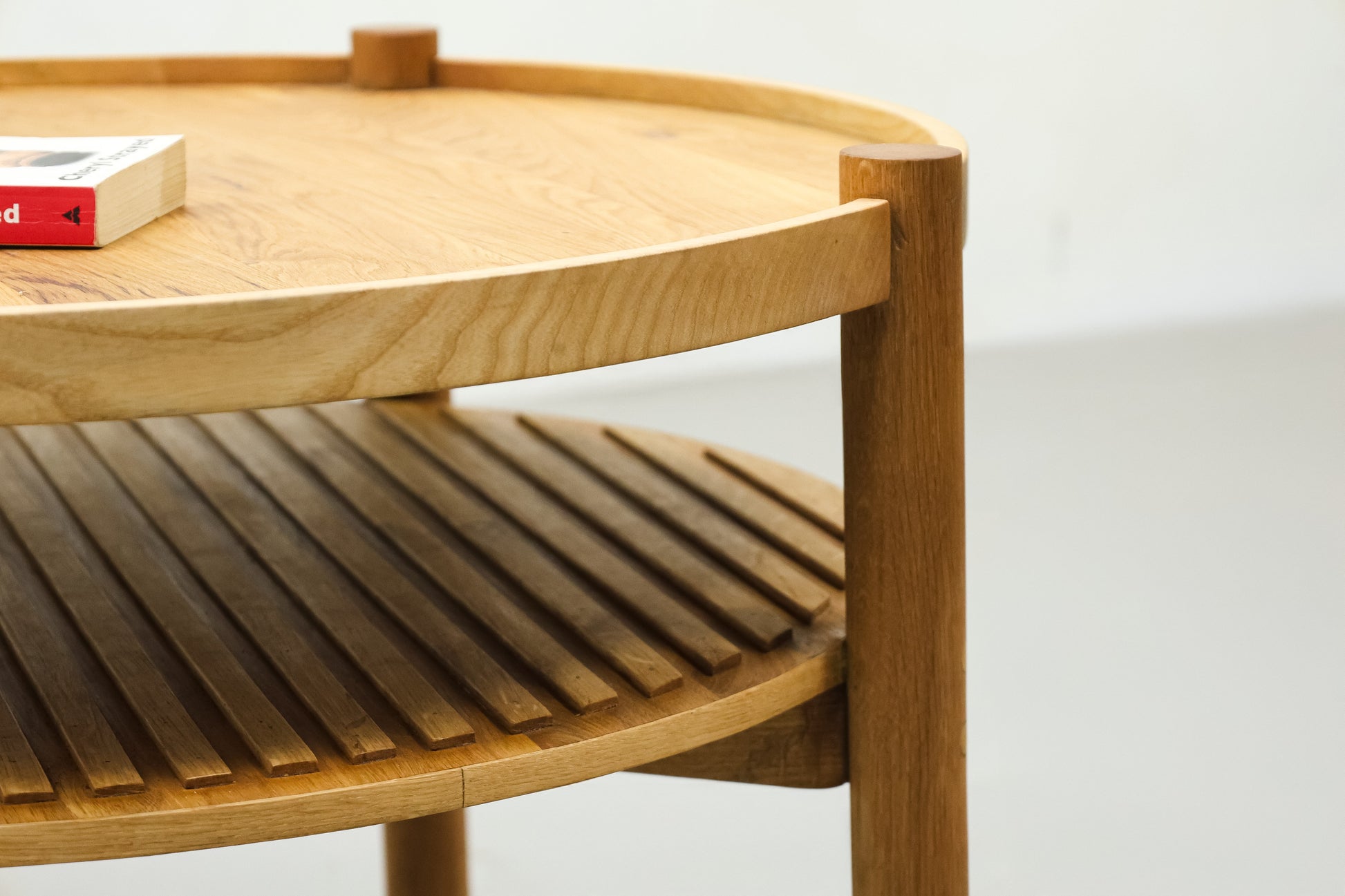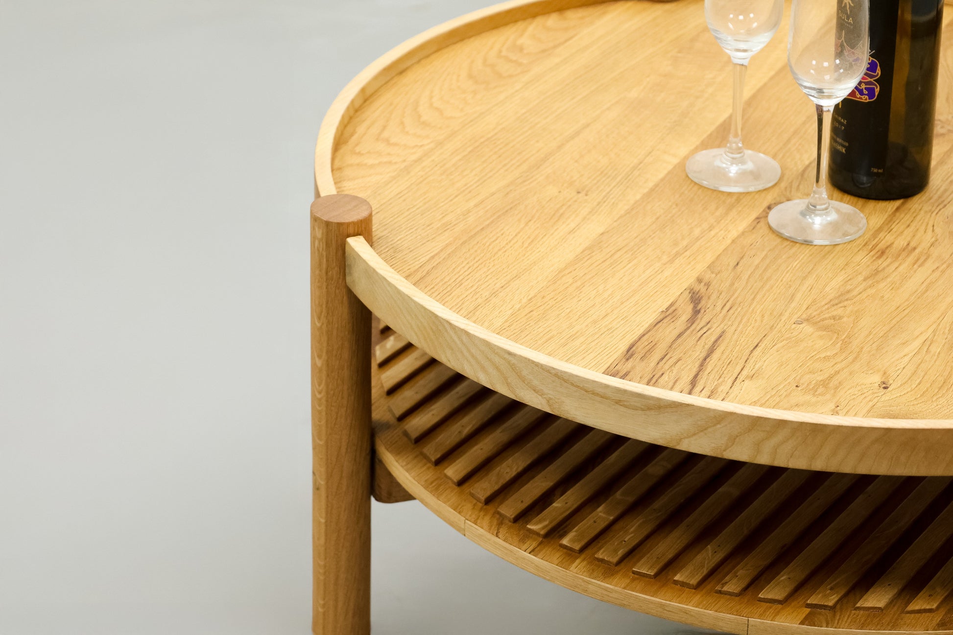 The Torii Roundo Table pairs functionality with sculptural elegance. Crafted from solid oakwood, it features a dual-layer round design supported by slender spindle legs. The fluted lower shelf adds both storage and texture, creating depth and visual interest. Its warm wood tones and clean lines make it a versatile piece, perfect for living rooms, reading corners, or cozy lounge setups.